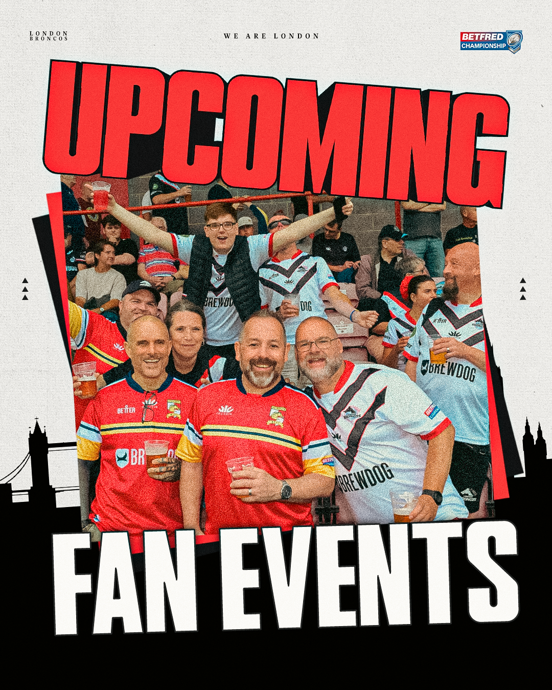 UPCOMING FAN EVENTS! London Broncos Fan Group invite you to join them on Saturday 18 th October at 7.30pm at Belushi’s Sports bar in London Bridge. The Group have secured a bar within the venue called The Dugout with and live music. The event is completely free of charge and everyone is warmly invited to attend to engage with other London Broncos fans as a social event. Their programme of events for the remainder of the year are as follows: Welcome Party - Saturday 18 th October 7.30pm 2 nd Ashes Test – Saturday 1 st November 2pm 3 rd Ashes Test – Saturday 8 th November 2pm Broncos Christmas Party – Saturday 6 th December 7.30pm Please note Saturday is a FREE event and no tickets are required. #WeAreLondon